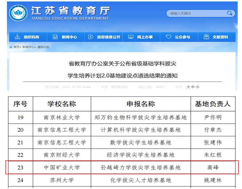 近日,江苏省教育厅公布了首批省级基础学科拔尖学生培养计划2.0基地建设点遴选结果,我校孙越崎力学拔尖学生培养基地成功入选,为我校唯一入选的基础学科拔尖培养基地。