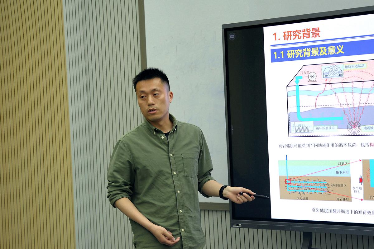 会上,朱其志教授、刘日成教授、殷鹏飞老师、魏超老师分别作了《准脆性岩石多尺度损伤本构关系研究》《恒法向刚度边界条件下岩石节理剪切-非线性渗流特性研究》《不同加载路径下的页岩各向异性力学特性研究》《预脉冲组合压裂下水力裂缝扩展及缝网形成机制研究》的学术报告。