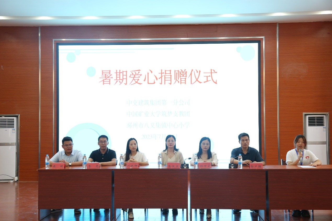 筑梦公益暑期支教团联合中交建筑集团第一分公司在邳州市八义集镇中心小学开展暑期爱心捐赠活动。中交建筑集团第一分公司人力资源部(党委组织部)部门经理、工会委员高迎立、高级业务经理刘晓娜、项目工程部长吴双,邳州市少先队员负责人杜万云,邳州市八义集镇中心小学校长郭广超,中国矿业大学澳门六合彩最准资料