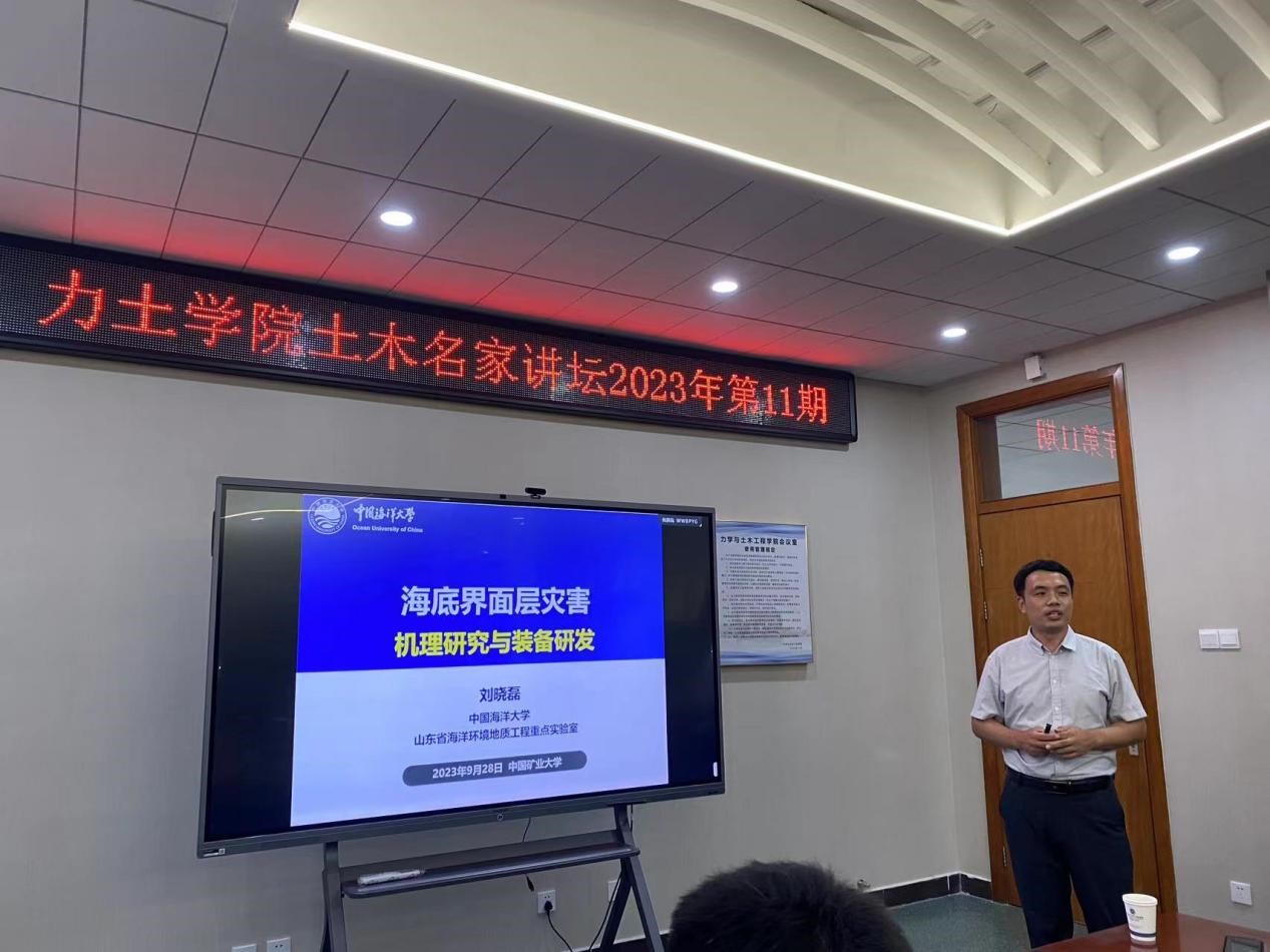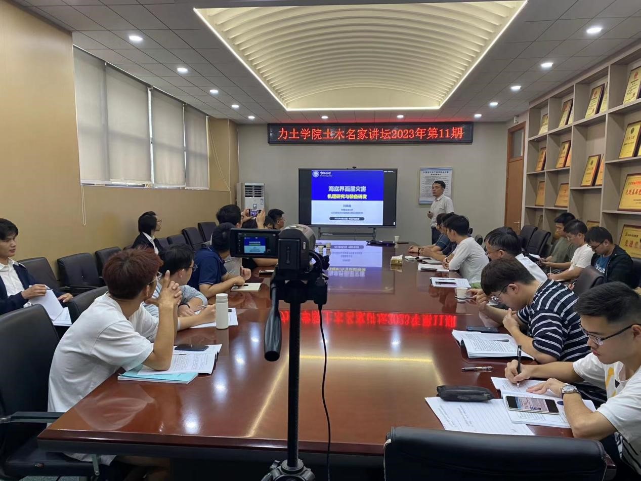 组织召开土木名家讲坛(2023年第十三期),特邀中国海洋大学山东省海洋环境地质工程重点实验室副主任、国家优青获得者刘晓磊教授作《海底界面层灾害:机理研究与装备研发》的学术报告,李元海教授、王迎超教授、宋雷教授等在内30余名师生参会交流。