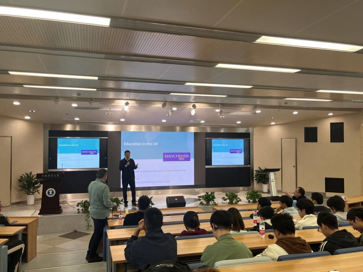 活动分为报告分享和对话交流两个环节。报告分享环节由工程力学2021-2班班主任刘江峰教授主持。刘老师介绍了Jivkov教授的研究方向与主要研究成果,向同学们阐述了学习力学、外语在职业生涯和工作中作用。Jivkov教授详细介绍了英国教育的阶段及入学的适应年龄,重点介绍了硕士及博士研究生入学的英语要求及留学费用,分享了出国留学的详细流程及入学面试建议。他强调了学习英语的重要性,建议同学们利用好自己的时间,不仅仅将自己的功课完成好,要提升英语口语交流及语言表达能力。