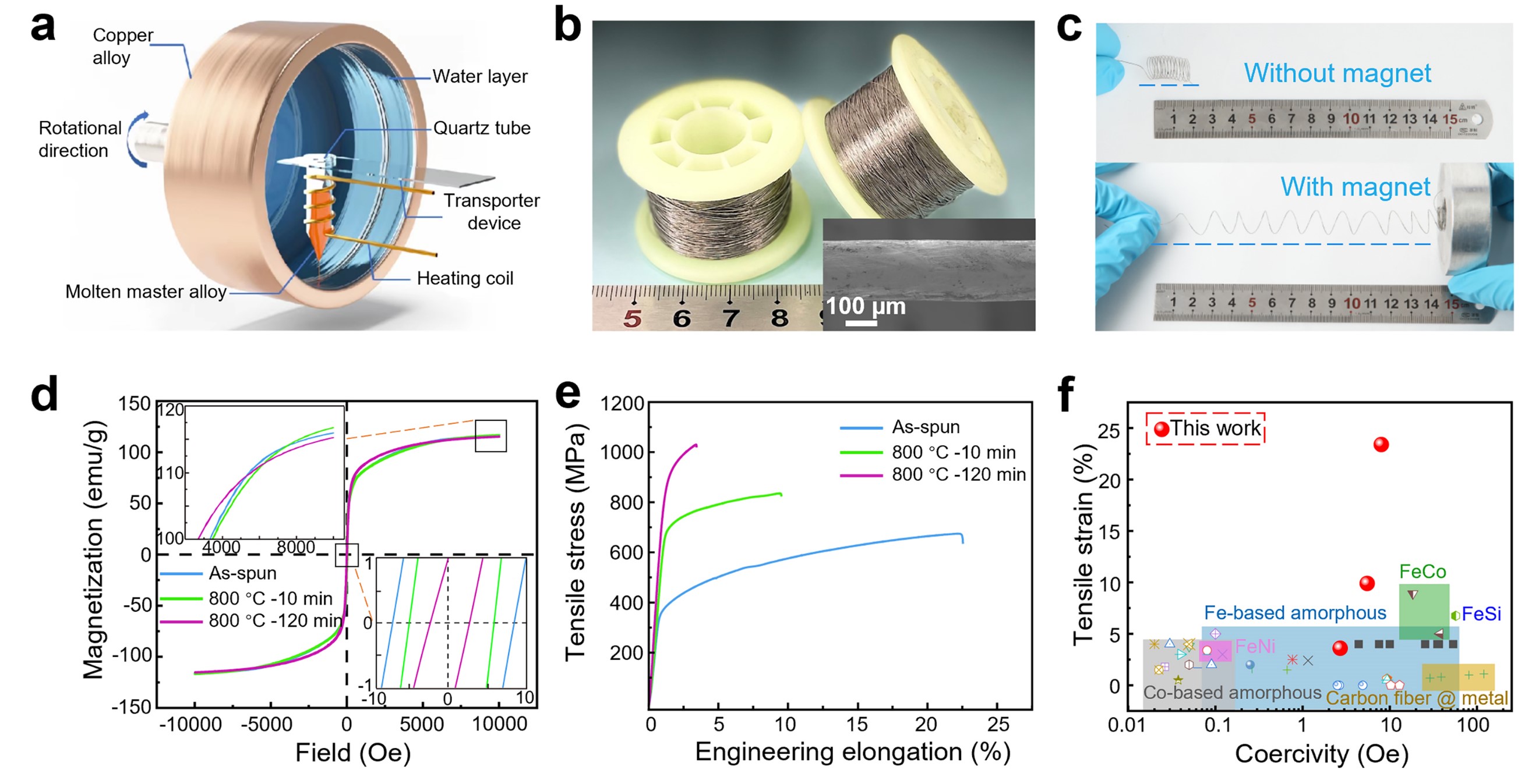 高性能软磁合金纤维在能量转换、传输和储存中起着至关重要的作用。传统的非晶合金纤维具有优异的软磁性能,但几乎没有拉伸塑性。随着高技术装备、多功能复合材料、柔性电子等的发展,在长期服役中能够承受拉伸、扭转和剪切载荷的微米尺度软磁纤维的需求量大增。长期以来,制备兼具优异软磁性能与力学性能的高熵合金纤维仍面临挑战。