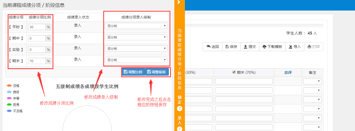 方法2:如果该教学班已经录入过成绩,需要进入到教学班录入界面(具体路径看第二点),进入教学班录入界面后,点击左侧黄色框,在里面修改比例和级制,如下图:
