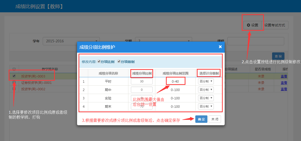 进入成绩比例设置界面,然后选择教学班,点击设置,根据需要设置级制和比例,如下图所示: