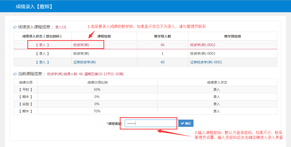 进入界面后,选择可录入的教学班,输入课程密码(请联系澳门六合彩最准资料