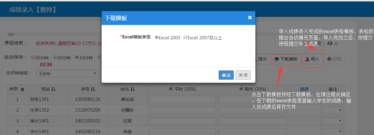 进入成绩录入界面后,有2种成绩录入方式,分别为网上直接录入和下载模板录入。