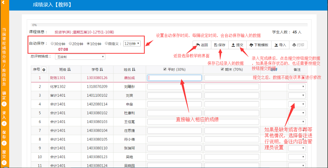 注意:成绩输入完成之后按提交按钮提交成绩,提交后成绩在这个界面不能再修改。