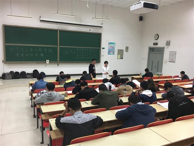 活动开始前,刘晴老师和兼职辅导员路铭老师、刘园园老师带领工作人员到竞赛现场指导活动安排,监考人员佩戴好工作证,布置黑板、整理考场、领取试卷、组织签到,活动按照预先安排的流程有条不紊地进行着,等待参赛同学到达考场。七点整,竞赛正式开始。参赛同学们整齐有序地坐在位置上认真作答。这不仅仅是一份代表着分数的测试,更是一种鞭策自我进步,提醒自己作为先进分子的责任和担当。考试完毕,大家有序离场,由党站相关负责人打扫教室并将试卷运回党站。