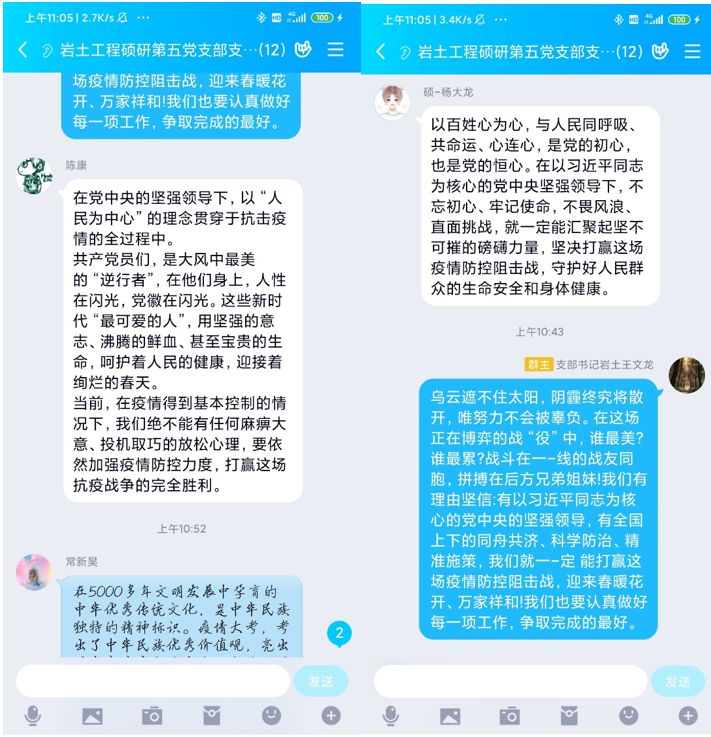 岩土硕研第一党支部以“疫情防控工作中的所见所闻、所行所为、所思所想”为主题开展线上活动,樊进城同学在此次活动中分享了自己疫情期间从事志愿服务的工作内容和感悟。结构与防灾工程第一党支部积极推进党团共建,党支部与共建的团支部成员一同观看纪录片《战役一线党旗红》,并以“抗击疫情期间党员先锋模范作用发挥”为主题,开展线上学习交流活动。同样是线上讨论,岩土硕研第五党支部组织支部成员结合自身实际,讨论疫情防控过程中学生党员的担当,认为作为学生党员应该带头做好表率,带头执行党中央关于疫情防控的决策部署,带头配合疫情防控,带头听从学校安排,增强防控意识。暖通空调硕研党支部与结构与防灾工程第二党支部采用组织线下学习的方式,通过观看中国战役录影片、党员走访宿舍、分享交流会等方式,发挥党团共建的优势,调动更多的同学参与到本次活动中来。结构与防灾工程第二党支部利用线下组会的形式,以党员先锋模范作用为主题,以返校以来学校工作开展过程中参与其中的志愿者为例,表明了学生党员应当的责任和义务,要增强“四个意识”,坚定“四个意识”,做到“两个维护”,勠力同心、汇聚力量,坚决在党中央的领导下打赢这次疫情防控阻击战。