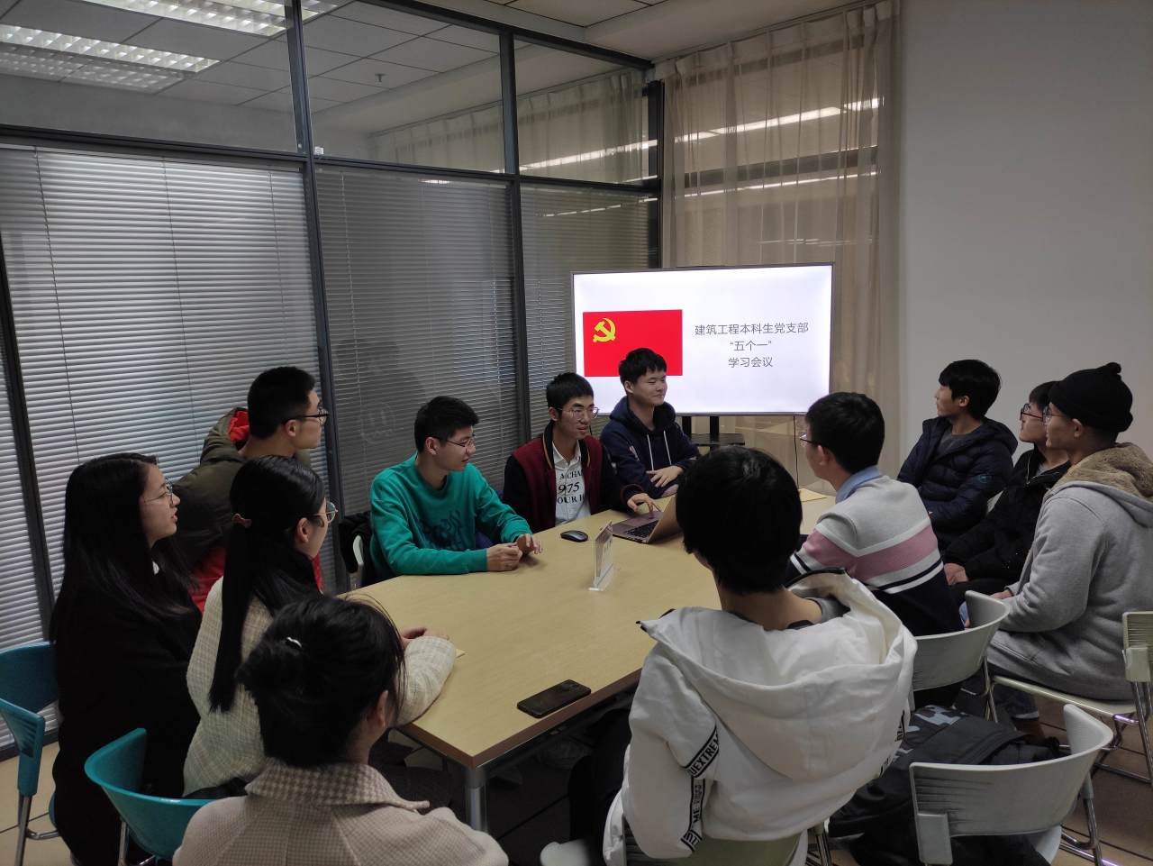 建筑工程本科生党支部在图书馆201-1研修室开展了“五个一”教育实践活动,会议由党支部学生副书记卢艺文主持,支部全体成员参与了本次活动。