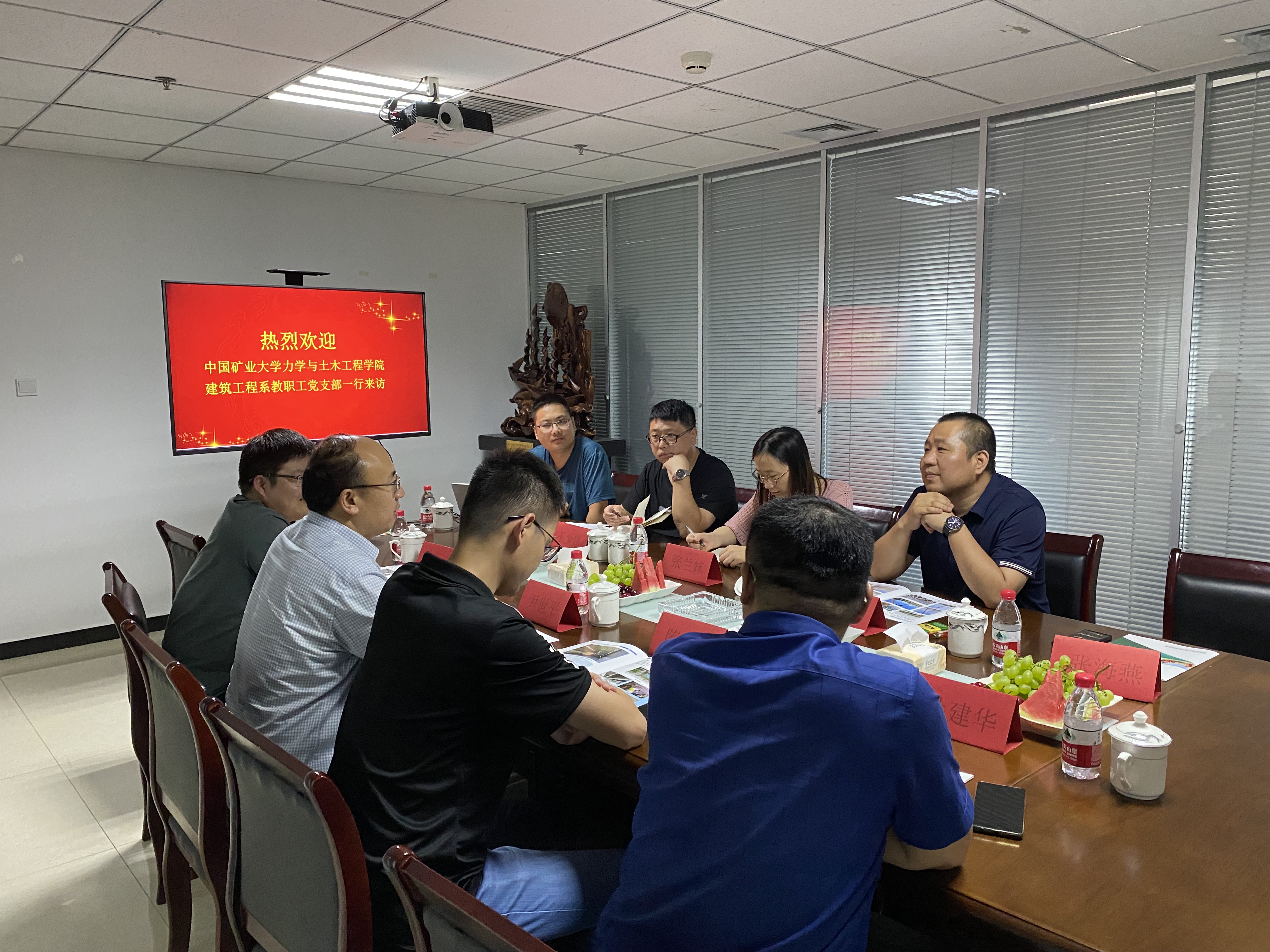 随后,建工系教职工党支部委员到中交河北工程有限公司进行交流,受到了董事长侯喜东的热情接待。中交河北工程有限公司董事长侯喜东、总经理杨勇、总工王少伟、办公室主任张兰妹等参加调研交流会。会上,总经理杨勇对公司的发展历程、业务范围和在建工程情况进行了详细介绍。双方就土木工程领域智能化升级的发展进行了充分的沟通和讨论。支委一行对目前施工现场智能建造的应用情况和水平有了详细的了解,为后续校企合作奠定基础。