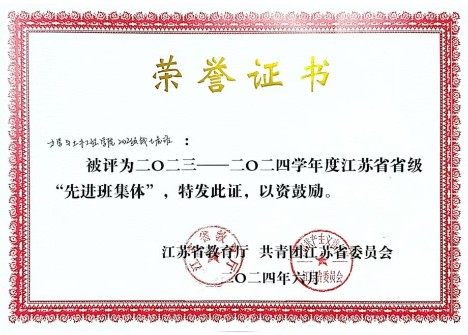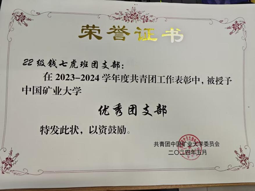 钱七虎班荣登中国矿业大学第十九届“青春矿大”年度人物,荣获江苏省省级“先进班集体”,中国矿业大学“校级优秀团支部”,获评全国大学生暑期社会实践“镜头中的三下乡”优秀图片团队奖,获评全国大学生社会实践“千校千项”项目活动优秀团队,获评江苏省大中专学生志愿者暑期文化科技卫生“三下乡”社会实践活动优秀团队,获评长三角高校大学生暑期社会实践优秀团队。同时钱七虎班党支部“赓续红色基因、弘扬科学家精神、践行工程报国之志——“红盾铸魂育人计划”系列主题党日活动”荣获全省高校“最佳党日活动”,荣获中国矿业大学年度安全示范班集体,连续三次获评优良学风班、九次获得优良学风流动红旗,班级专业课成绩排名年级第一、英语四级通过率100%、奖学金获得率100%,班级成员获得江苏省大学生土木工程结构创新竞赛特等奖、中国国际大学生创新大赛江苏省一等奖等校级及以上科创竞赛奖项共40余项。