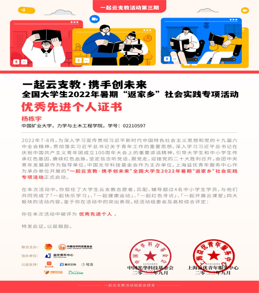 全国大学生2022年暑期“返家乡”社会实践专项活动优秀先进个人证书