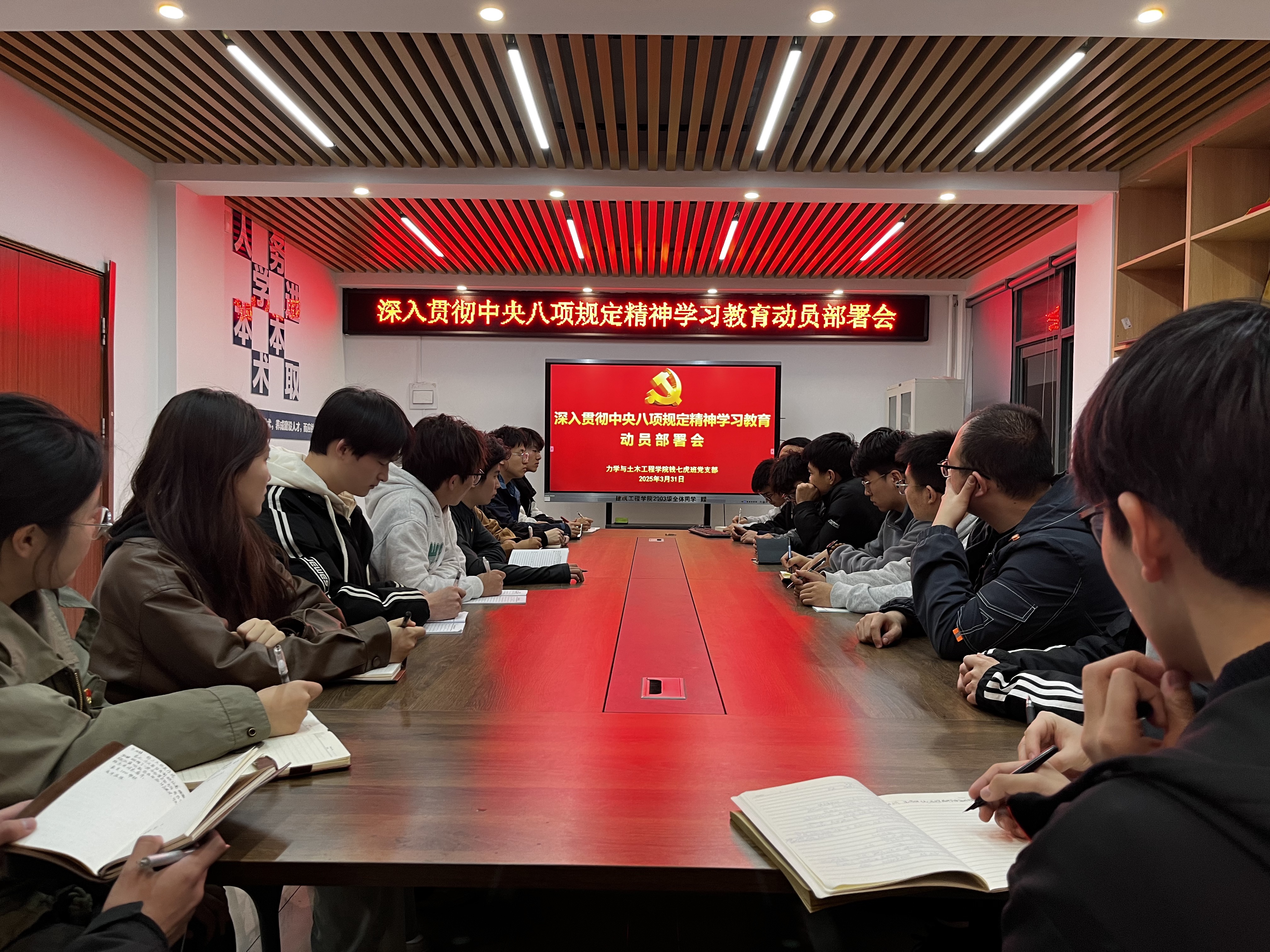 工作组会议室召开深入贯彻中央八项规定精神学习教育动员部署会,传达学习学校党委《关于在全校开展深入贯彻中央八项规定精神学习教育的通知(中矿委[2025]10号)》文件精神,安排部署党支部深入贯彻中央八项规定精神学习教育工作。党支部全体党员参加会议,部分入党积极分子、发展对象列席会议。